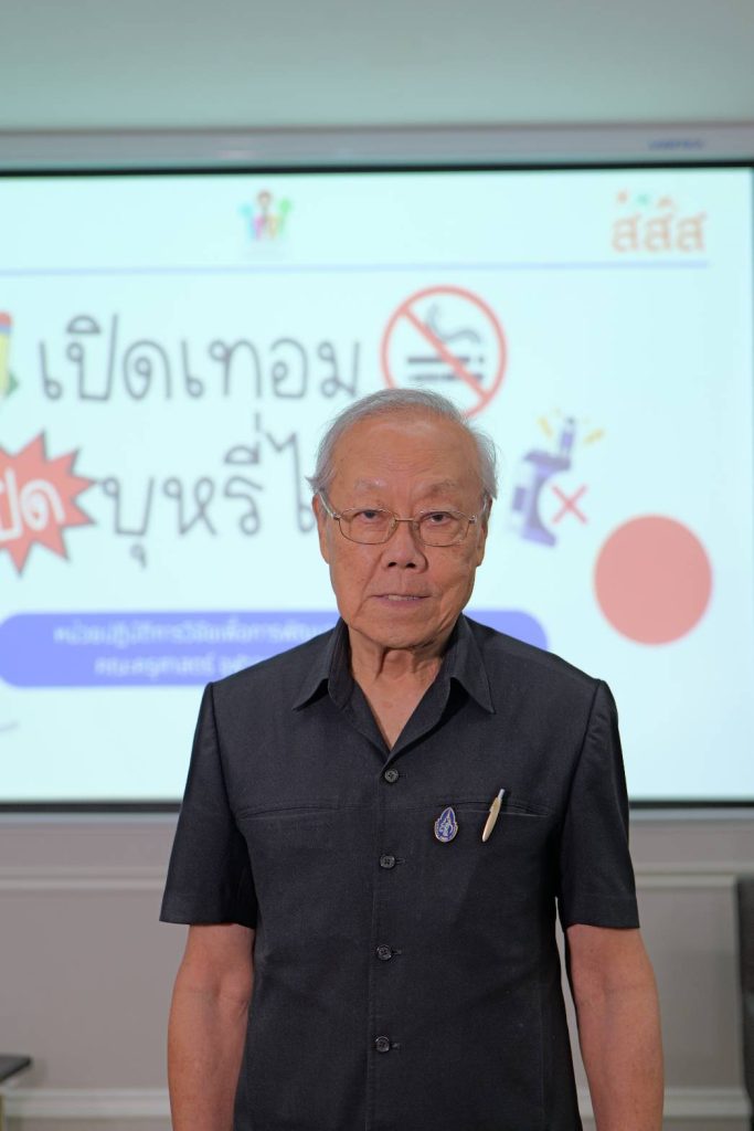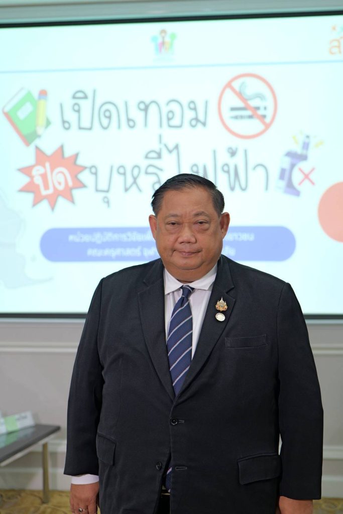 ศาสตราจารย์ ดร.สมพงษ์ จิตระดับ ที่ปรึกษาโครงการฯ กล่าวถึงสถานการณ์การขับเคลื่อนงานเชิงรุกเพื่อปราบปรามและป้องกันการแพร่ระบาดของบุหรี่ไฟฟ้าในประเทศไทยได้รับความร่วมมือจากหลากหลายหน่วยงานที่บูรณาการการทำงานทั้งด้านการสร้างความตระหนักรู้ถึงอันตราย การพัฒนาศักยภาพของแกนนำและเครือข่ายเยาวชน การออกกฎหมายและมาตรการควบคุม รวมถึงการเฝ้าระวังอย่างจริงจังและเร่งด่วน จากผลสำรวจสุขภาพประชาชนไทยในช่วงปี พ.ศ. 2567 – 2568 ของคณะแพทยศาสตร์โรงพยาบาลรามาธิบดีร่วมกับ สสส. สถาบันวิจัยระบบสาธารณสุข (สวรส.) และภาคีเครือข่าย พบว่า เยาวชนอายุ 15–29 ปี มีแนวโน้มการใช้บุหรี่ไฟฟ้าเพิ่มขึ้นจากร้อยละ 5.8 ในปี พ.ศ. 2562 เป็นร้อยละ 12.2 ซึ่งสะท้อนถึงความรุนแรงและความเร่งด่วนของปัญหา ทั้งนี้ ยังมีการนำเสนอมาตรการควบคุมจากต่างประเทศ เช่น สหรัฐอเมริกา ซึ่งห้ามใช้บุหรี่ไฟฟ้าในสถานศึกษา และกำหนดให้บุหรี่ไฟฟ้าเป็นสินค้าควบคุม ห้ามขายให้แก่ผู้ที่มีอายุต่ำกว่า 21 ปี และต้องมีใบอนุญาตในการจำหน่าย ขณะที่สหราชอาณาจักรมีการขยายเขตปลอดบุหรี่ไฟฟ้าครอบคลุมโรงเรียน สนามเด็กเล่น และโรงพยาบาล พร้อมออกกฎหมาย Tobacco and Vapes Bill ที่ห้ามขายผลิตภัณฑ์ยาสูบแก่ผู้ที่เกิดหลังวันที่ 1 มกราคม 2009 เป็นต้นไป สะท้อนถึงแนวทางการสร้างภูมิคุ้มกันในสถานศึกษาผ่านการสอดแทรกเนื้อหาสร้างความตระหนักรู้ และการกำกับดูแลอย่างเข้มงวด อย่างไรก็ตาม บุหรี่ไฟฟ้ายังคงเป็นภัยเงียบที่แฝงด้วยเป้าหมายในการผลักดันให้ถูกกฎหมาย โดยอาศัยกลไกของกรรมาธิการวิสามัญในรัฐสภาไทย ผ่านระบบตลาดที่เข้าถึงได้ง่าย สะดวก และรวดเร็ว โดยเฉพาะในโลกออนไลน์และแอปพลิเคชันต่าง ๆ อีกทั้งยังมีการใช้กลุ่ม “นักสูบหน้าใหม่” ซึ่งเป็นเด็กและเยาวชน เป็นกลยุทธ์ในการขับเคลื่อนอย่างแยบยลและน่าวิตกยิ่ง